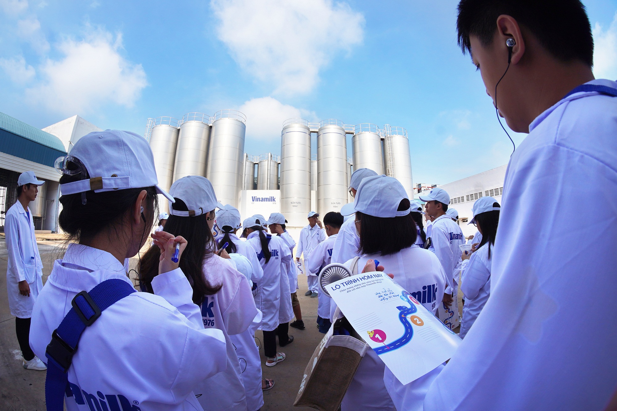 Các em chăm chú lắng nghe, ghi chép kĩ lưỡng về quy trình sản xuất để làm ra một hộp sữa tại siêu nhà máy Vinamilk: từ các bồn sữa khổng lồ, cho đến dây chuyền đóng hộp cứ 1 giây là cho ra đời 6-7 hộp sữa hay kho thông minh vận hành hơn 27.000 lô hàng hóa với sự điều khiển của máy tính…
