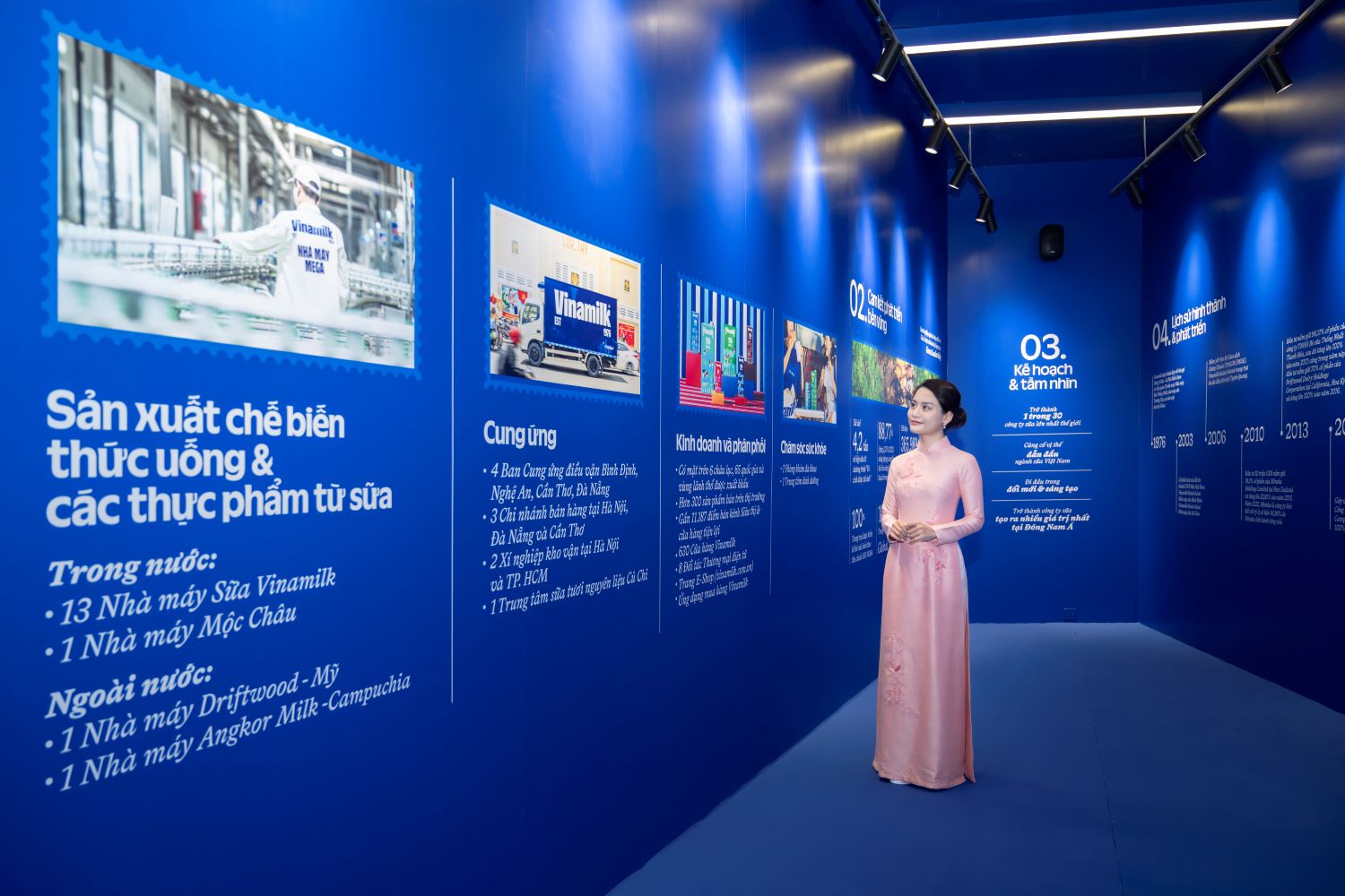 Không chỉ là nơi trưng bày sản phẩm, Vinamilk còn lồng ghép các thông tin về hành trình phát triển của doanh nghiệp – từ những ngày đầu thành lập đến vị thế là Thương hiệu Quốc gia hiện nay,đồng hành sự phát triển của đất nước. Khách tham quan tìm hiểu hành trình phát triển của thương hiệu sữa top 1 Việt Nam. (Ảnh: Vi Nam)