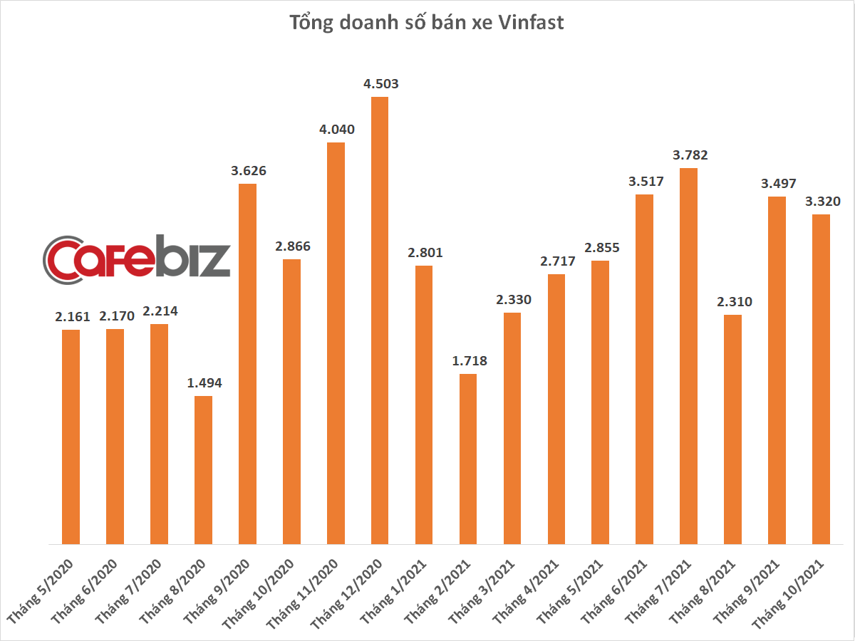 Công ty TNHH Kinh doanh Thương mại và Dịch vụ VinFast công bố kết quả kinh doanh ô tô tháng 10/2021, với tổng số 3.320 xe bán ra, gồm 2.218 xe Fadil, 537 xe Lux A2.0 và 565 xe Lux SA2.0.Sau khi đạt mức doanh số kỷ lục trong tháng 9/2021, số lượng xe VinFast Fadil bàn giao cho khách hàng trong tháng 10/2021 giảm nhẹ. Đây là tháng thứ 5 liên tiếp Fadil có số xe bán ra đạt hơn 2.000 xe.