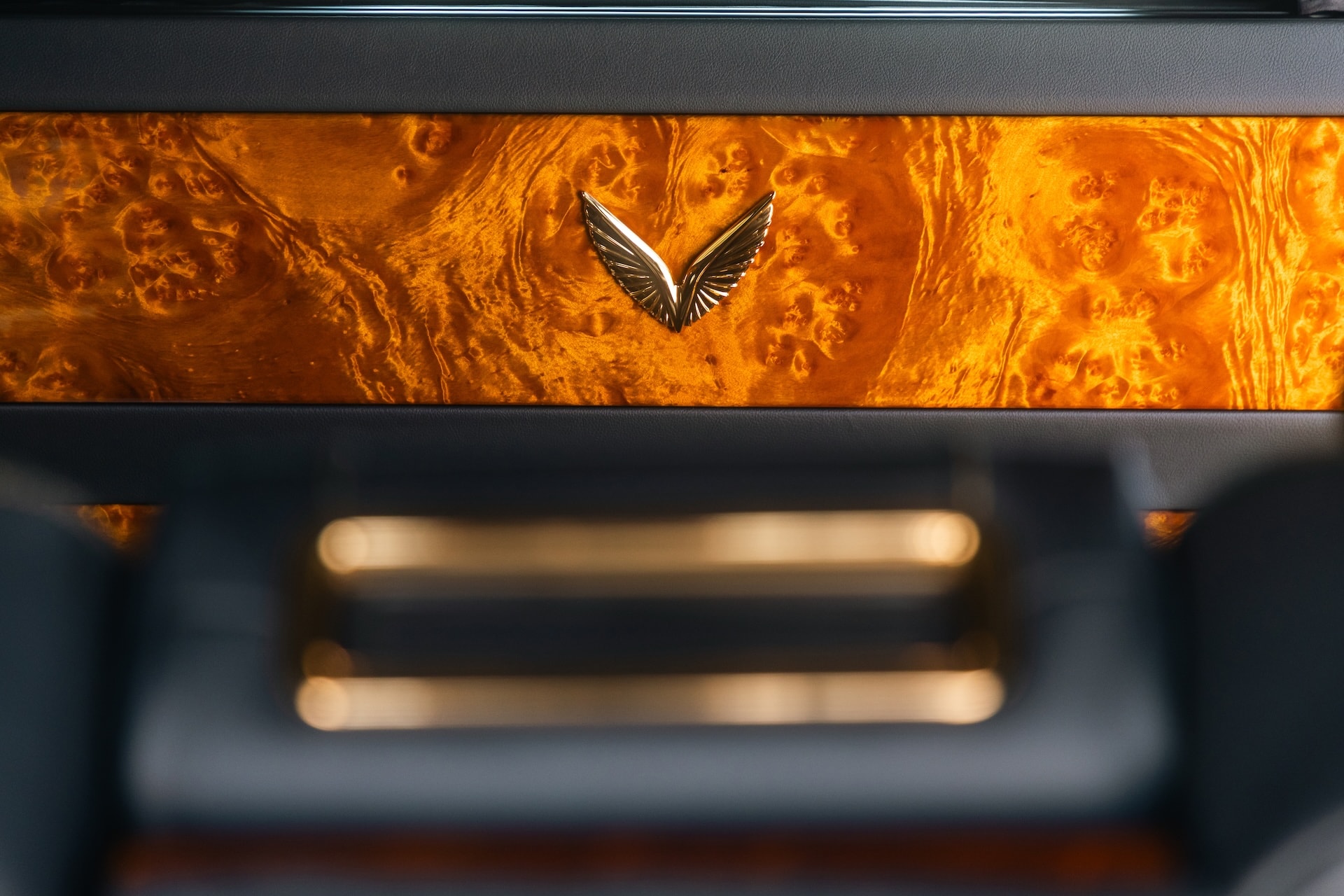 Nội thất được ốp, bọc và mạ bởi các loại vật liệu đặc biệt cao cấp như gỗ quý Golden Nanmu, da Nappa và vàng thật. Toàn bộ chi tiết mạ vàng trong và ngoài xe đều được làm hoàn toàn thủ công, với sự tài khéo, tinh tế và tỉ mỉ đến từng chi tiết.