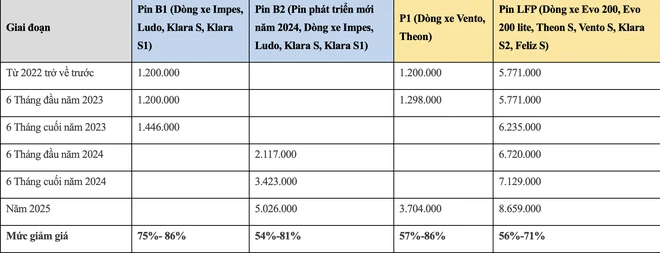 Mức giá trên áp dụng với khách hàng đã mua xe theo diện thuê pin và chỉ dành cho bộ pin đang đi kèm xe. Trong trường hợp khách hàng có nhu cầu mua pin mới, giá pin được tính theo mức niêm yết.