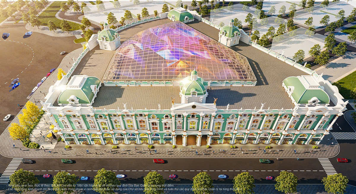 Tổ hợp lấy cảm hứng thiết kế từ cung điện châu Âu sang trọng, với các chi tiết phủ vàng thủ công, mang lại cảm hứng sống hoàng gia sang trọng cho cư dân Móng Cái. Tâm điểm của tổ hợp là không gian công cộng và tổ chức sự kiện trong nhà với phần mái vòm kính lớn lên tới 4.600m2 trang trí ánh sáng LED hiện đại. Tại đây, du khách có thể vừa tự do dạo bộ thư giãn, vừa hòa mình vào những hoạt động đặc sắc được tổ chức quanh năm. Công trình điểm nhấn này là đại diện cho thương hiệu đô thị Việt thế hệ mới tinh hoa, văn minh và giàu bản sắc.