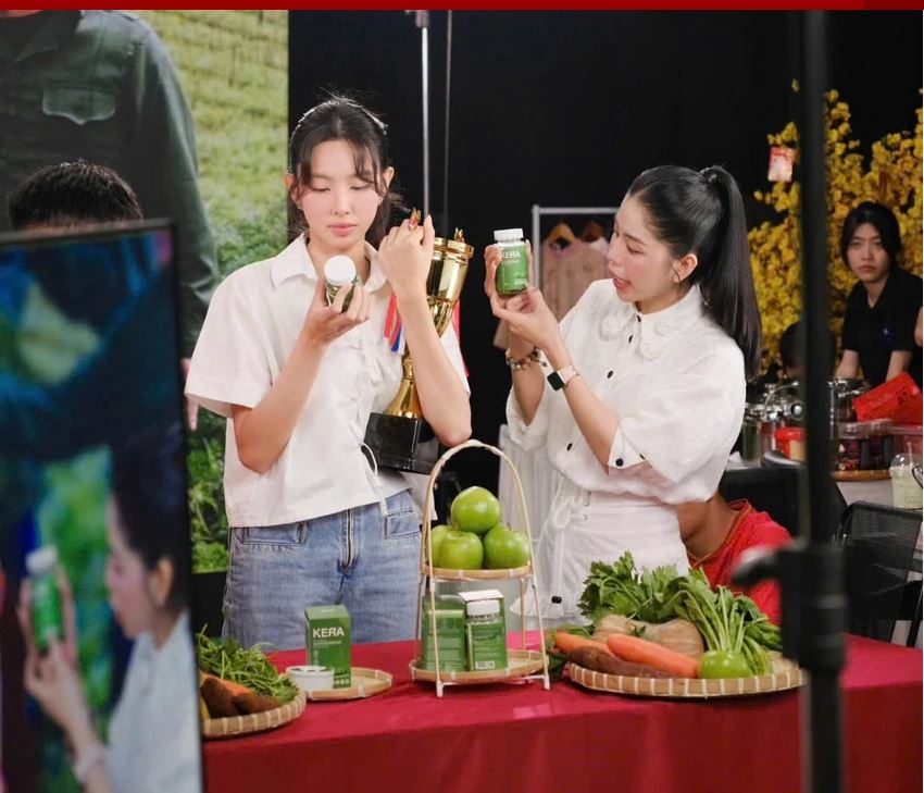 Hoa hậu Thùy Tiên trong một phiên livestream quảng cáo Kẹo rau củ Kera.