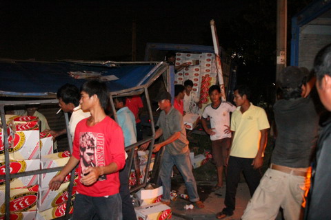 Lúc này, nhiều thanh niên khác túa ra mỗi người một tay phụ giúp chuyển toàn bộ số hàng sang xe khác.