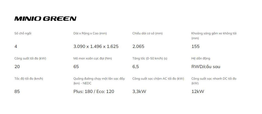 Ngoài ra, VinFast Minio Green có tầm hoạt động lần lượt 180 km cho bản Plus và 120 km cho bản Eco, xe còn có sạc nhanh DC 12kW bên cạnh sạc AC 3,3 kW. Thông số này cho thấy xe chủ yếu phục vụ cho chặng ngắn ở đô thị hơn là đường dài.
