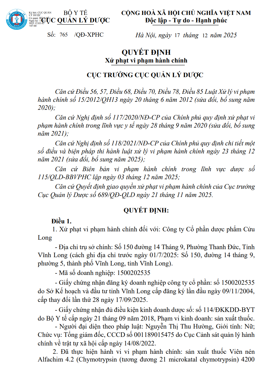 Mới đây, Phó Cục trưởng Cục Quản lý Dược Tạ Mạnh Hùng đã ký ban hành Quyết định số 765/QĐ-XPHC về việc xử phạt vi phạm hành chính đối với Công ty Cổ phần Dược phẩm Cửu Long. Doanh nghiệp có trụ sở chính tại số 150 đường 14 Tháng 9, phường Thanh Đức, tỉnh Vĩnh Long; người đại diện theo pháp luật là bà Nguyễn Thị Thu Hường, Tổng Giám đốc công ty.