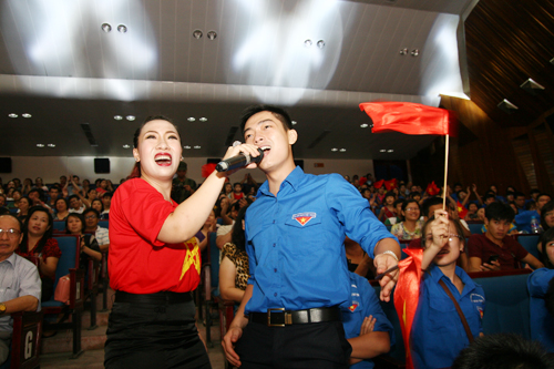 Chương trình ca nhạc "Đất nước bên bờ sóng" do báo Tuổi trẻ Thủ đô - Nhà Văn hóa Học sinh sinh viên Hà Nội tổ chức chính thức bắt đầu vào 20h nhưng từ 18h, không khí đã vô cùng rạo rực với sắc áo xanh tình nguyện và màu đỏ cờ Tổ quốc.